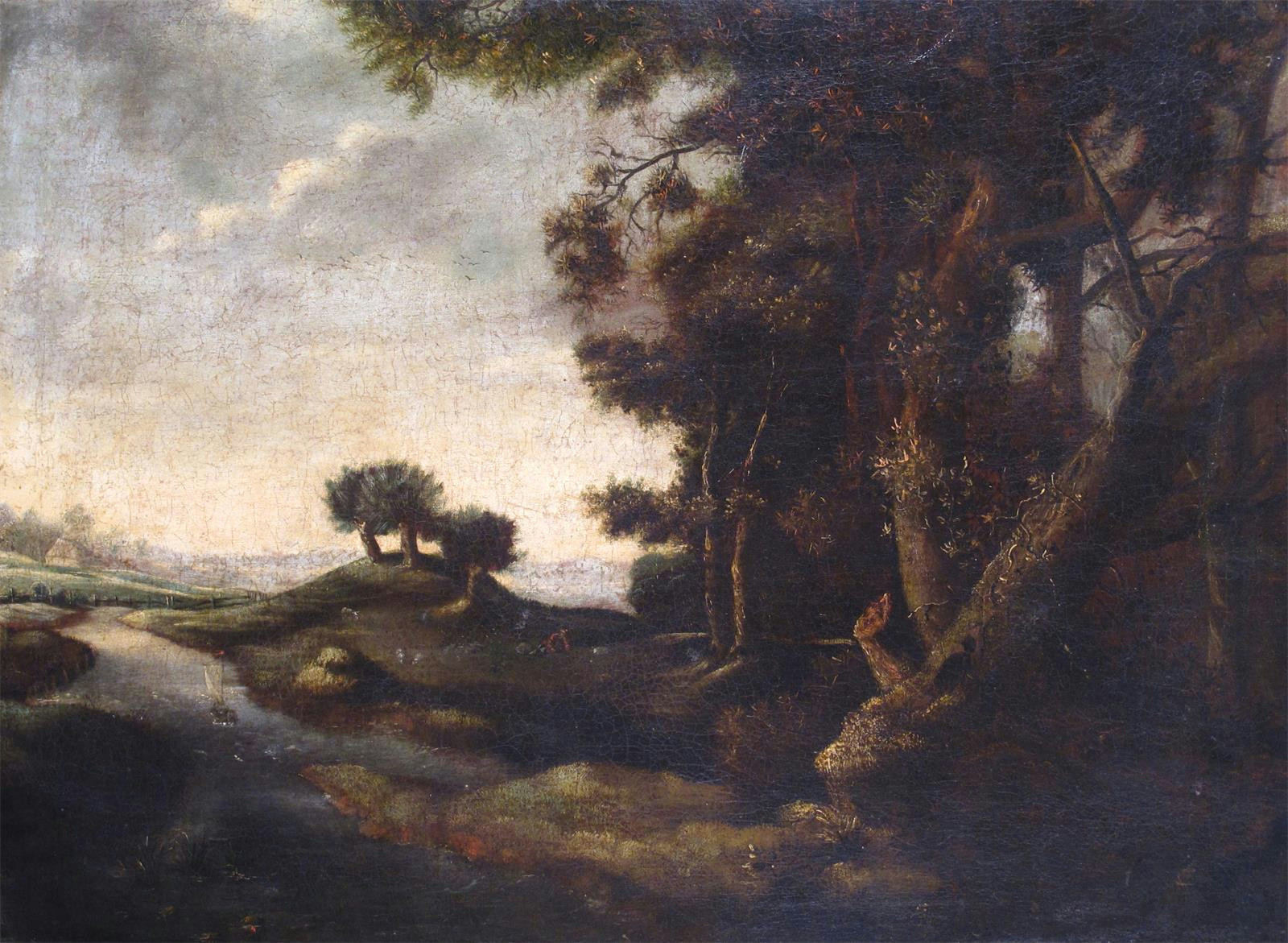Flemish School 18th Century Figures in a wooded river landscape Oil on canvas 79 x 106cm; 31 x 42in