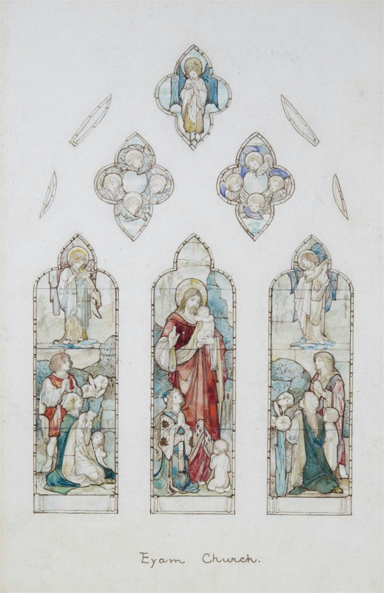 Stained glass window designs including one for Eyam Church