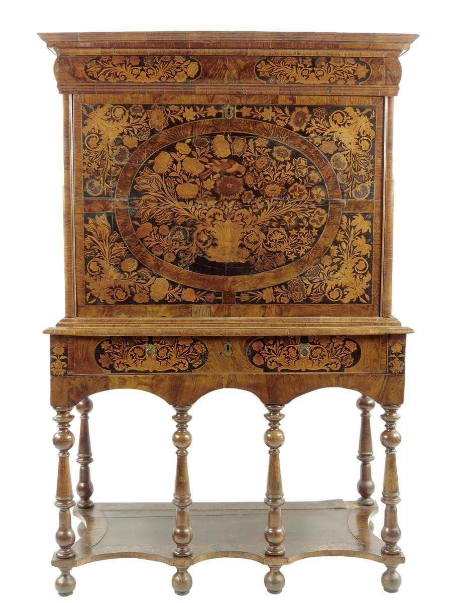 A William and Mary walnut and floral marquetry escritoire on stand, the moulded cornice above a cushion frieze drawer, to a hinged fall inlaid fruitwood with allover flowers and centered a bird with a brass eye, enclosing an arrangement of pigeon holes and eleven walnut veneered drawers around a central cupboard, the stand with marquetry panels and with a frieze drawer on baluster turned supports, a shaped solid undertier and ball feet, 170.5cm high, 11cm wide, 50.9cm deep.
