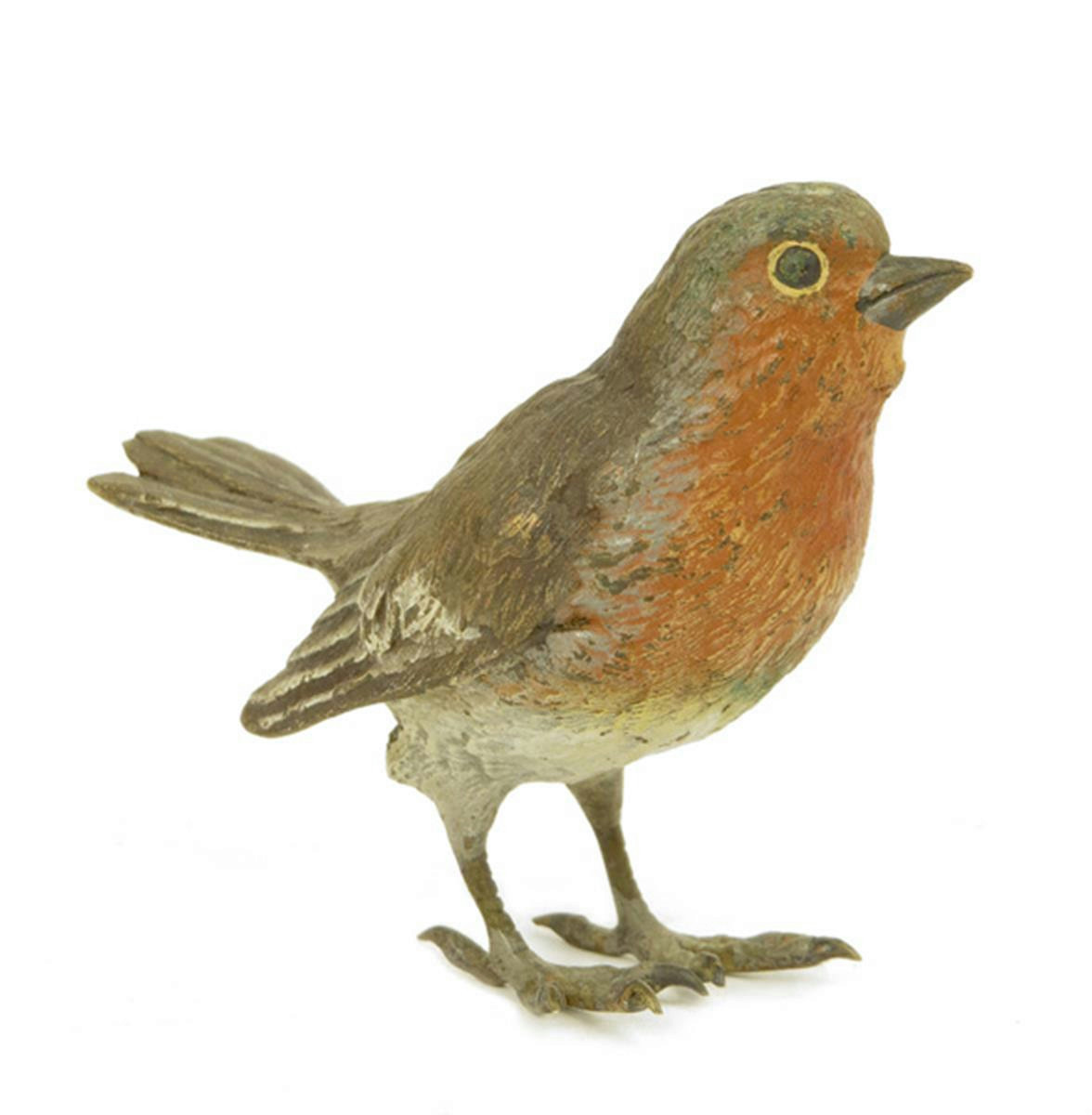 An Austrian cold painted bronze of a robin by Bergman, stamped 'GESCHUTZT' and faintly a 'B in a vase', numbered '1835', late 19th / early 20th century, one leg broken, 5.9cm high, 8cm long.