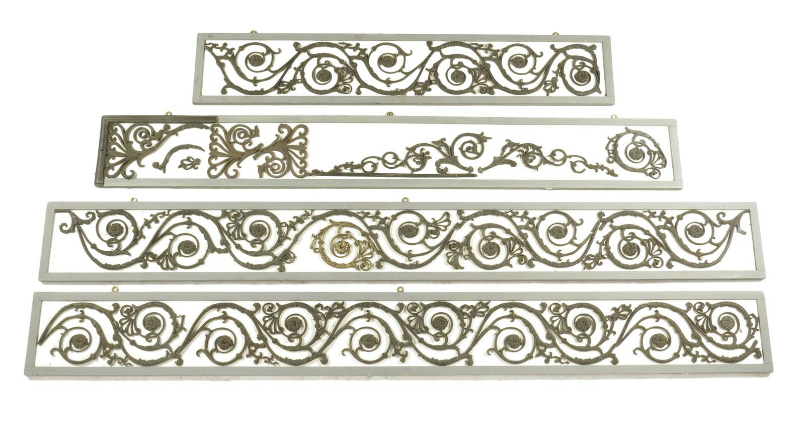 A collection of cast gilt bronze mounts, of scrolling flowers and foliage, later mounted on painted wood panels, late 18th / early 19th century, 257cm wide, 24.2cm deep, max. (4)