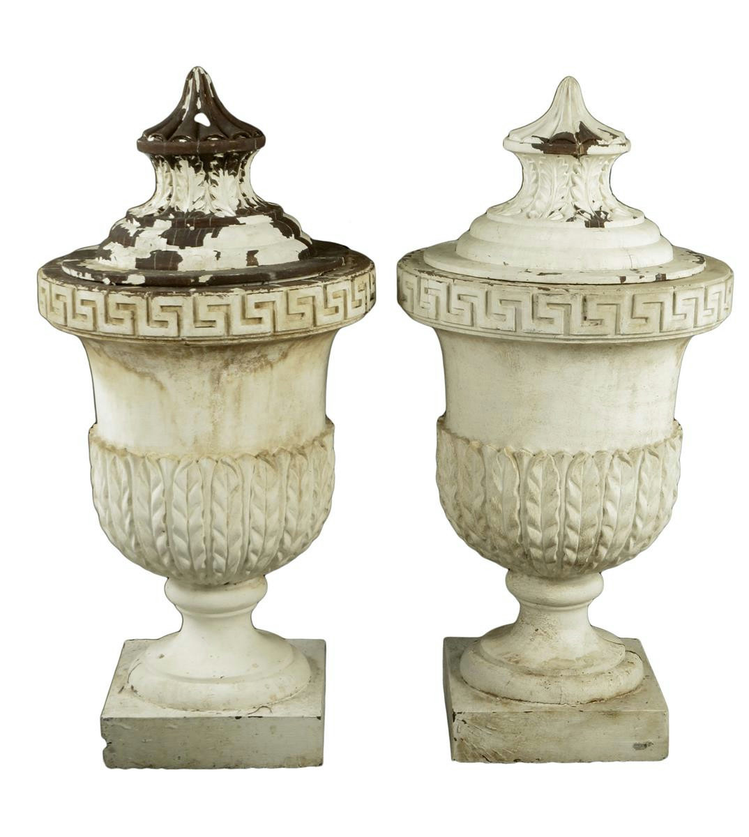 A pair of painted and carved wood lidded campana shaped urns, each with a Greek key rim above an acanthus wrapped body, 95.5cm high, 45.5cm diameter. (2)