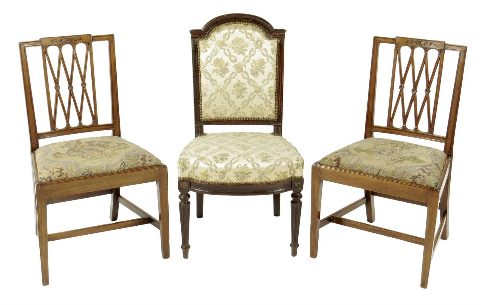 A pair of George III mahogany side chairs, each with a trellis splat back to a tapestry drop-in seat on square tapering legs united by 'H' stretchers, together with a French oak side chair with a padded back and seat on fluted legs. (3)