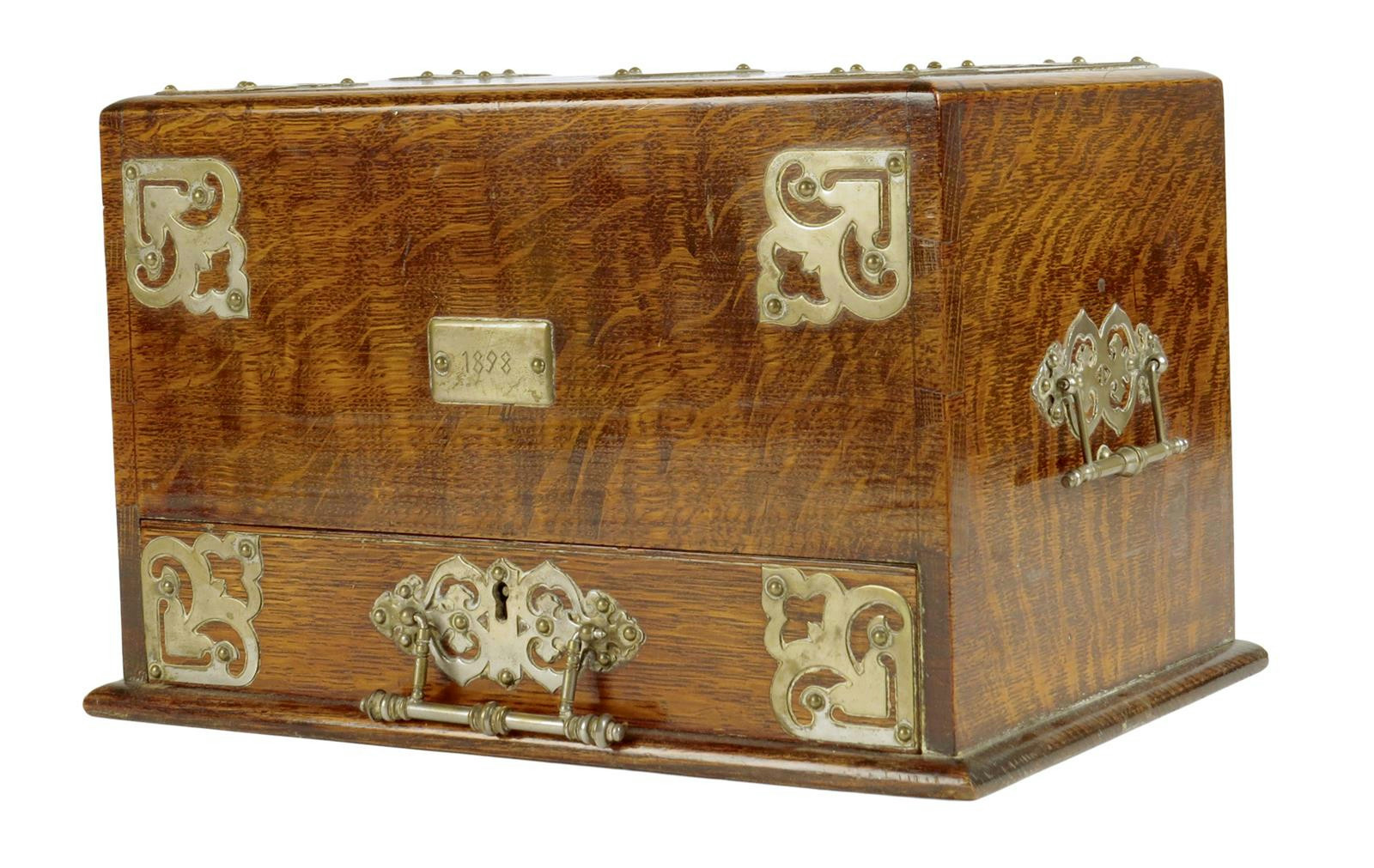 A late Victorian oak stationery cabinet, with silver plated mounts and handles, the hinged top applied a shield plaque with a monogram, the front with a plaque dated '1898', with a base drawer that pulls-out and activates the hinged stationery compartment with divisions for letters, stamped with registration number 'RD 278819', 10.5cm high, 31.2cm wide, 20.5cm deep.