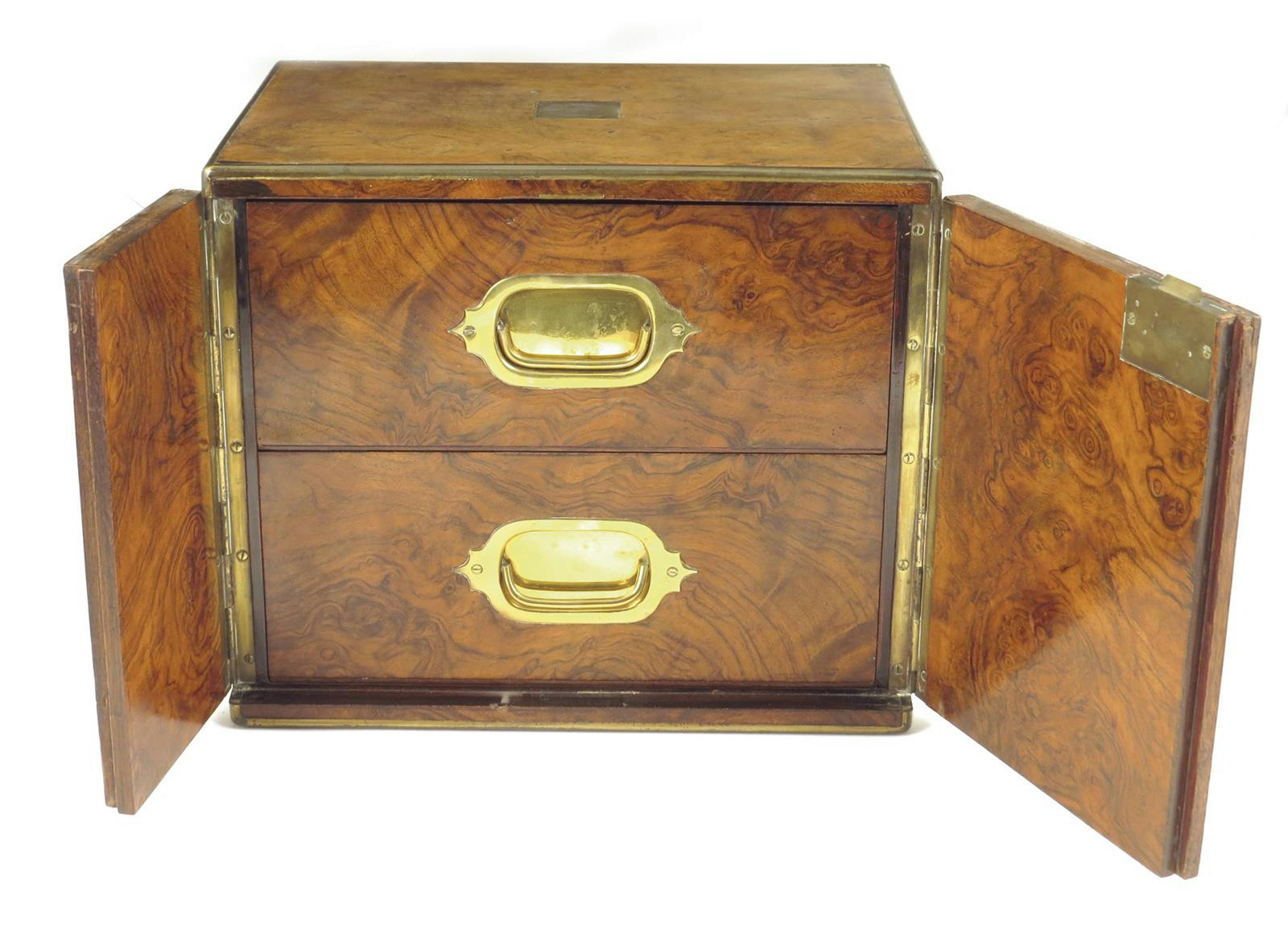 A Victorian walnut and brass mounted table cabinet, the top centred a vacant brass plaque, above two doors enclosing two drawers originally with divisions, with sunken brass handles and a Bramah lock, no key, 25.7cm high, 30.6cm wide, 22.2cm deep.