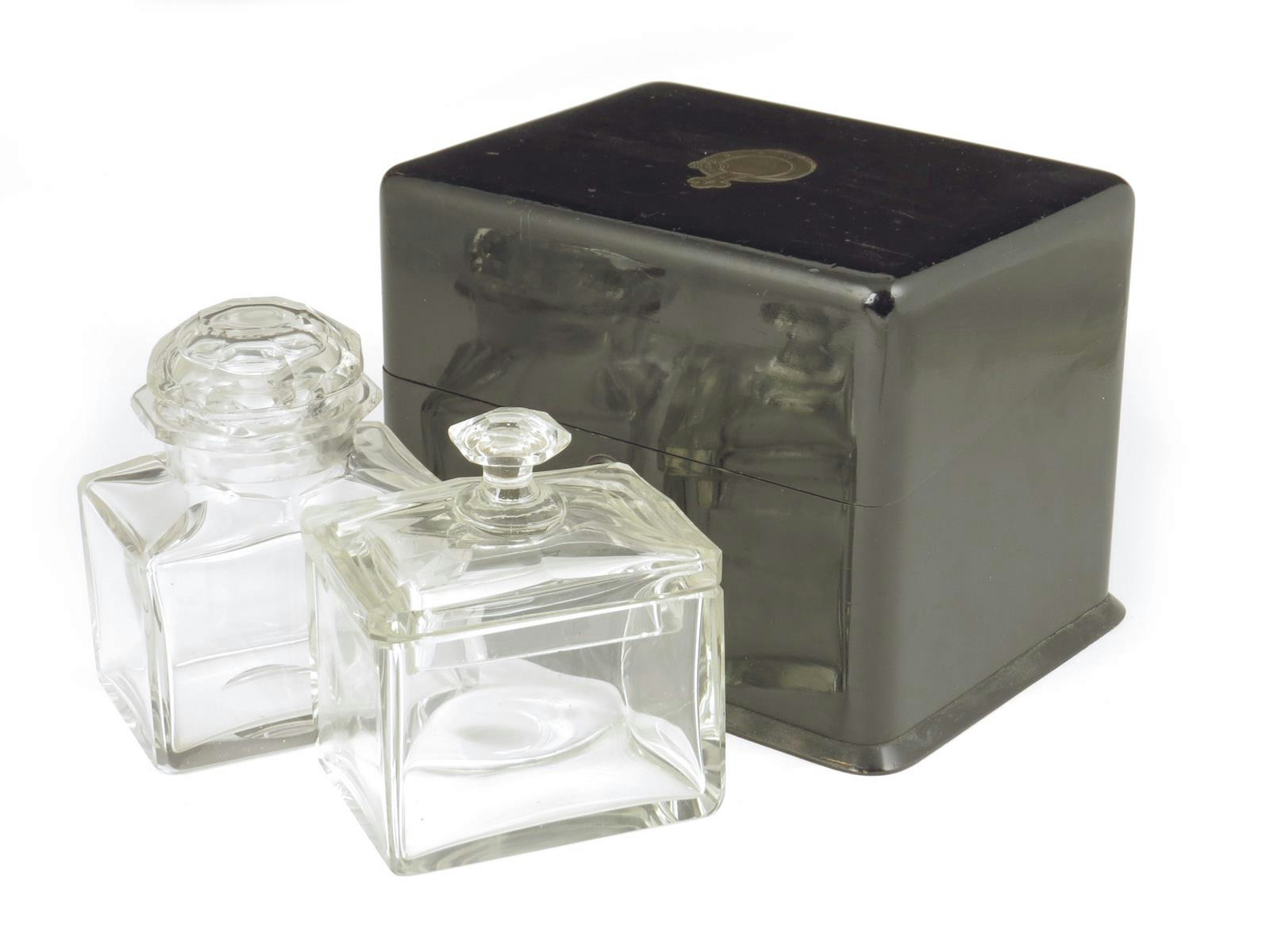 A 19th century continental ebonised scent bottle box, the hinged lid inlaid a brass garter, to a stepped divided and plush lined interior, with a glass box and cover and a scent bottle and stopper, 15.3cm high, 20.7cm wide, 15.4cm deep.