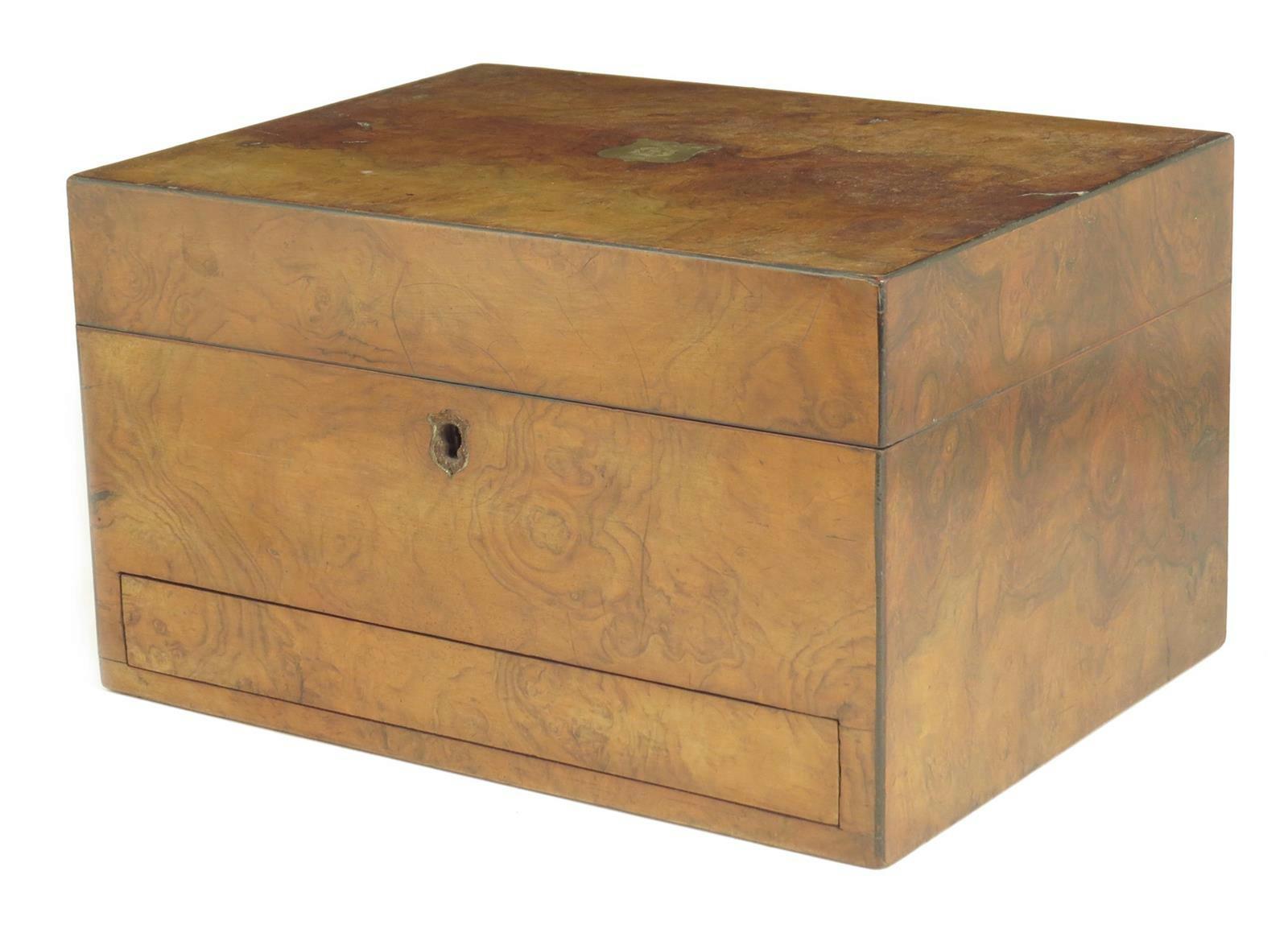A Victorian walnut toilet box, with ebonised edging, the hinged lid inset a brass shield inscribed with a monogram and the date 'DECR. 18TH 1876', the underside of the lid with a leather framed mirror and a divided leather pull-out tray with various silver plated lidded jars and boxes, with mother of pearl handled utensils to a sprung plush lined base drawer, 17.8cm high, 31cm wide, 23.2cm deep.