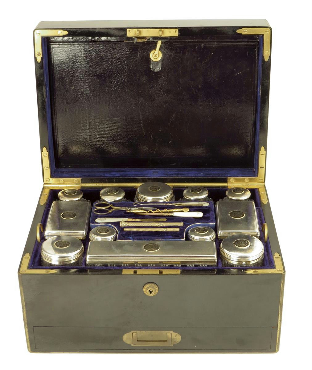 A Victorian ebony and brass mounted travelling toilet box by F. West, the hinged lid inset a monogram 'ECC', to a plush and leather lined interior, the lid inset a pouch and previously a hand mirror, to twelve cut glass and engine turned silver gilt topped bottles, jars and boxes, all with a monogram, by J. B, London 1870, fitted with various utensils and implements including a corkscrew, stamped 'F. WEST MANUFACTURER TO HER MAJESTY & THE ROYAL FAMILY, 1 ST. JAMES'S Street', with a Bramah lock, with side carrying handles and with a base drawer for jewellery, 19.5cm high, 35.6cm wide, 25.7cm deep.