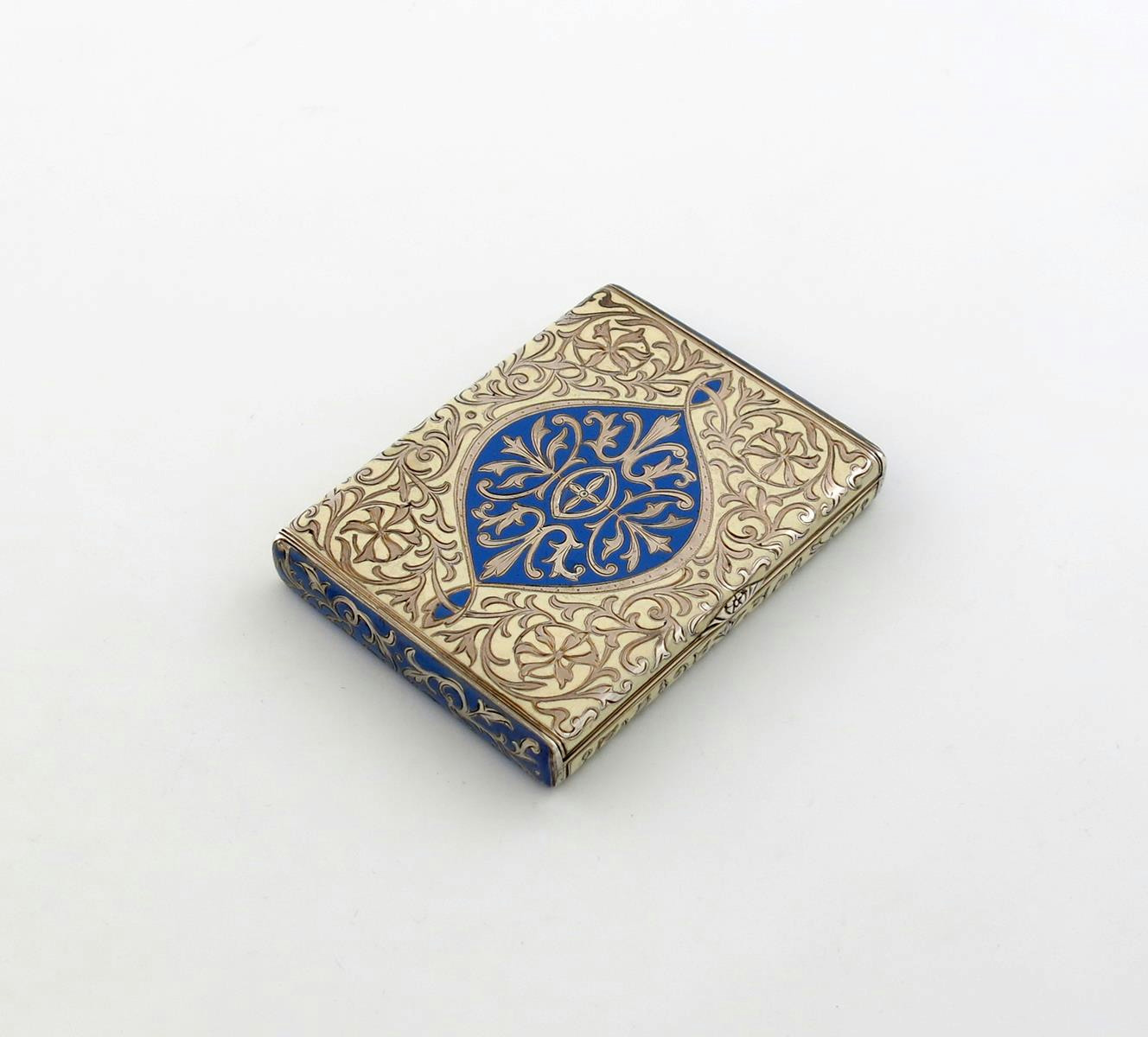rectangular form, with blue and cream enamelled foliate scroll decoration, length 8.3cm.