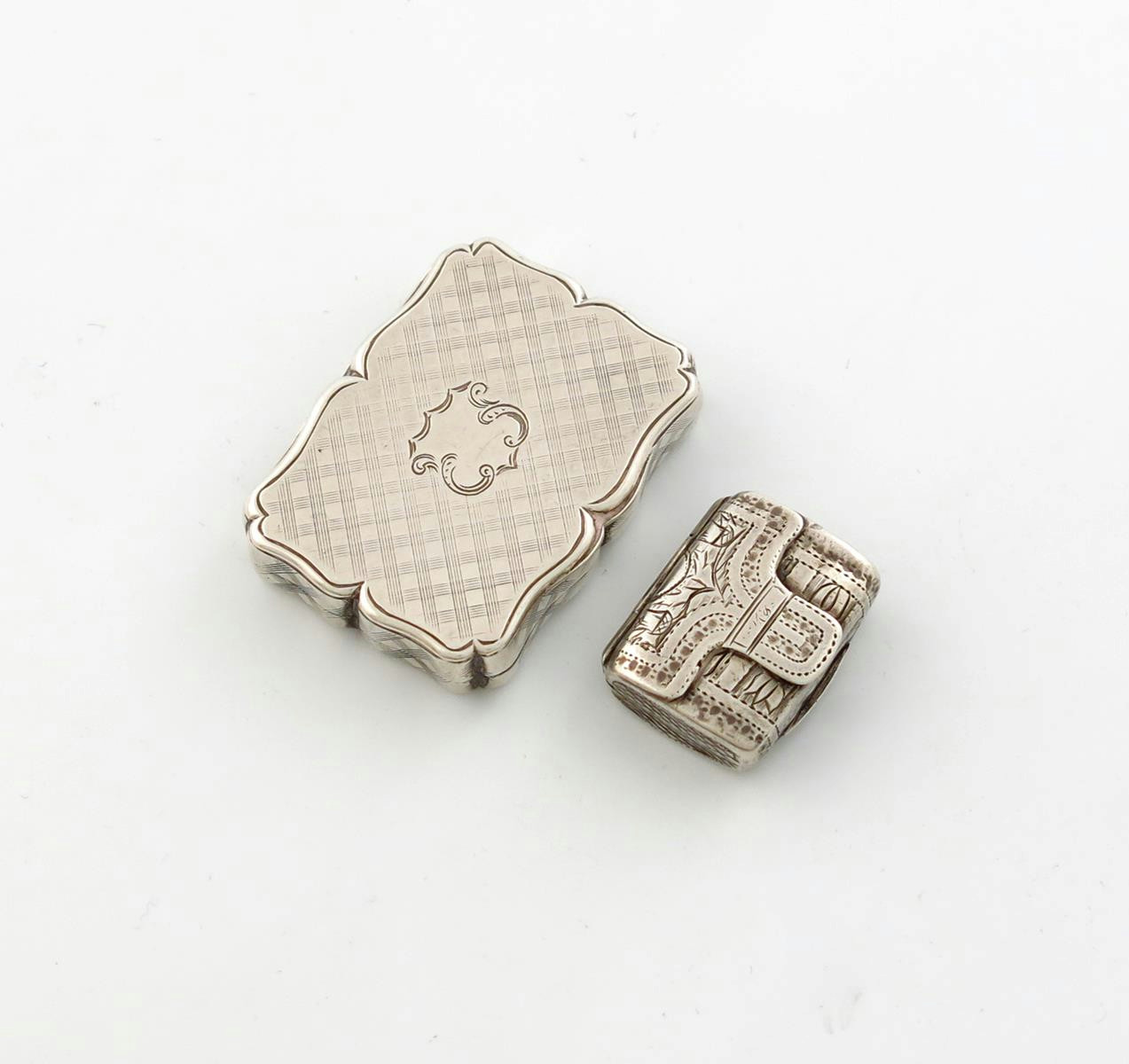 rectangular form, engraved lattice decoration, the hinged cover opens to reveal a pierced foliate scroll grille, length 3.8cm, plus a George III silver vinaigrette of rectangular purse form, by Lawrence and Co, Birmingham 1818, length 2.4cm, approx. weight 1oz. (2)