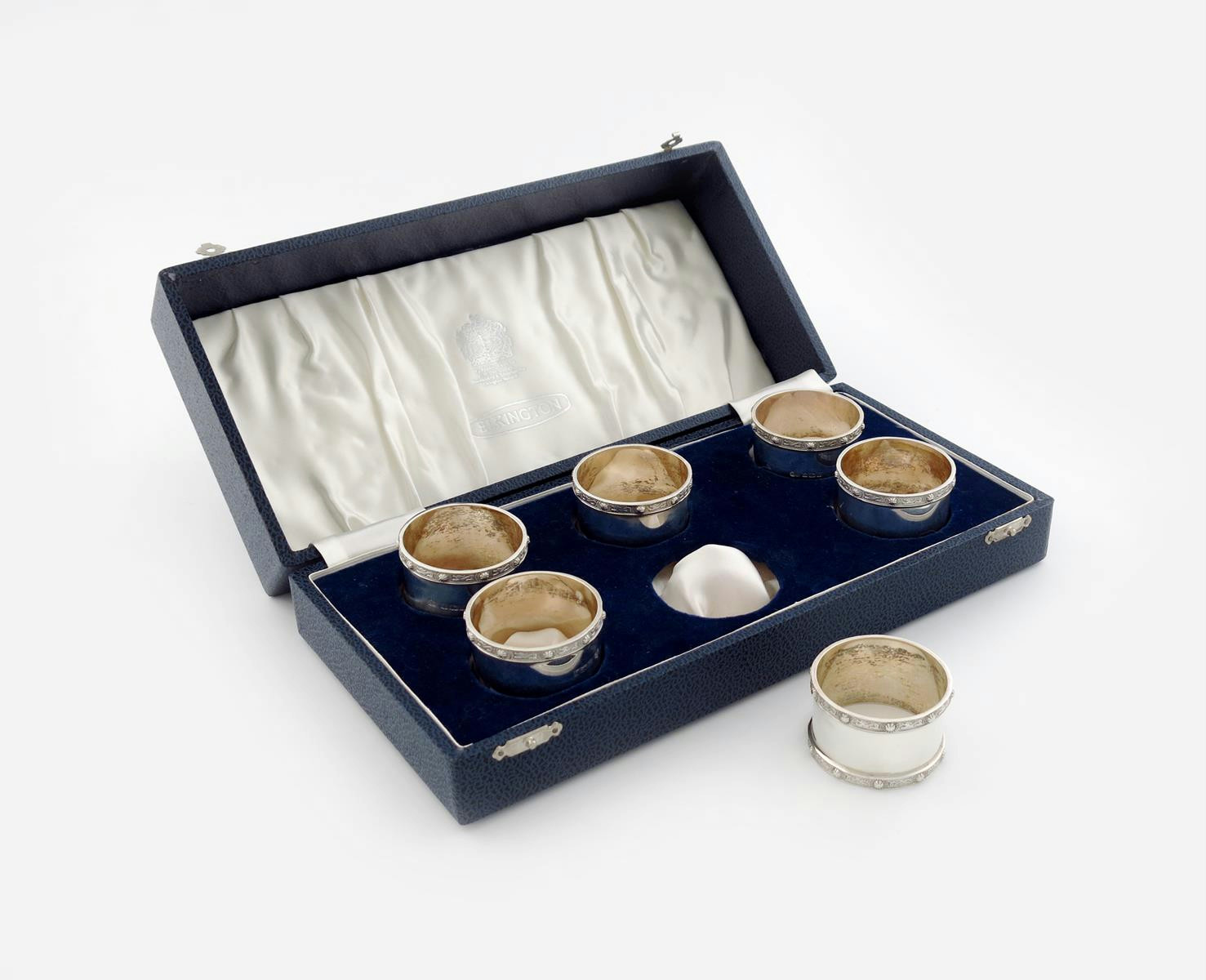 circular form, decorated with repeating borders of a dragon and rosettes, in a fitted case, approx. weight 7oz.