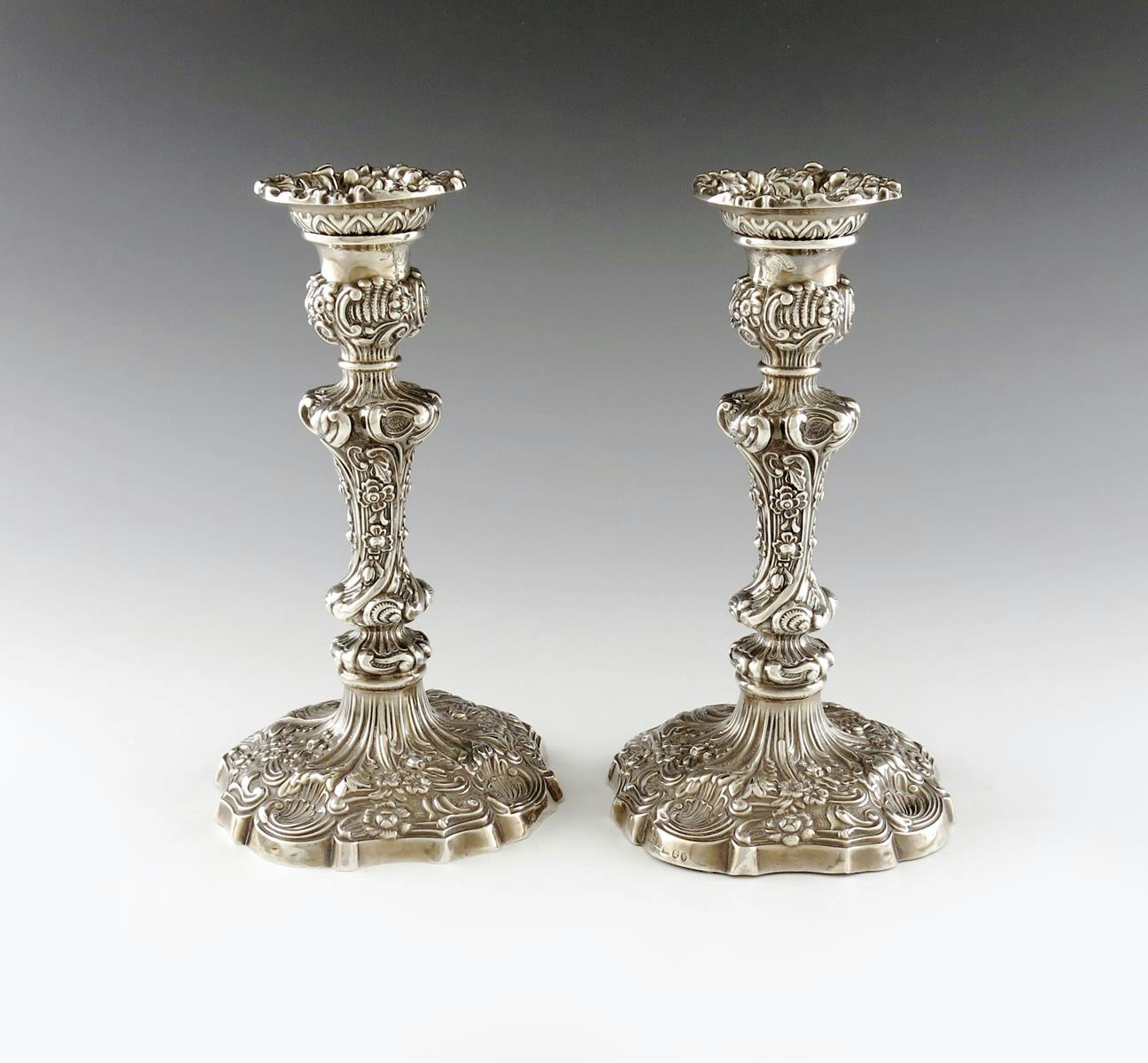 in the Rococo manner, foliate scroll decoration, detachable drip pans, on raised shaped circular bases, (some holes), engraved with a crest, height 28.8cm. (2)