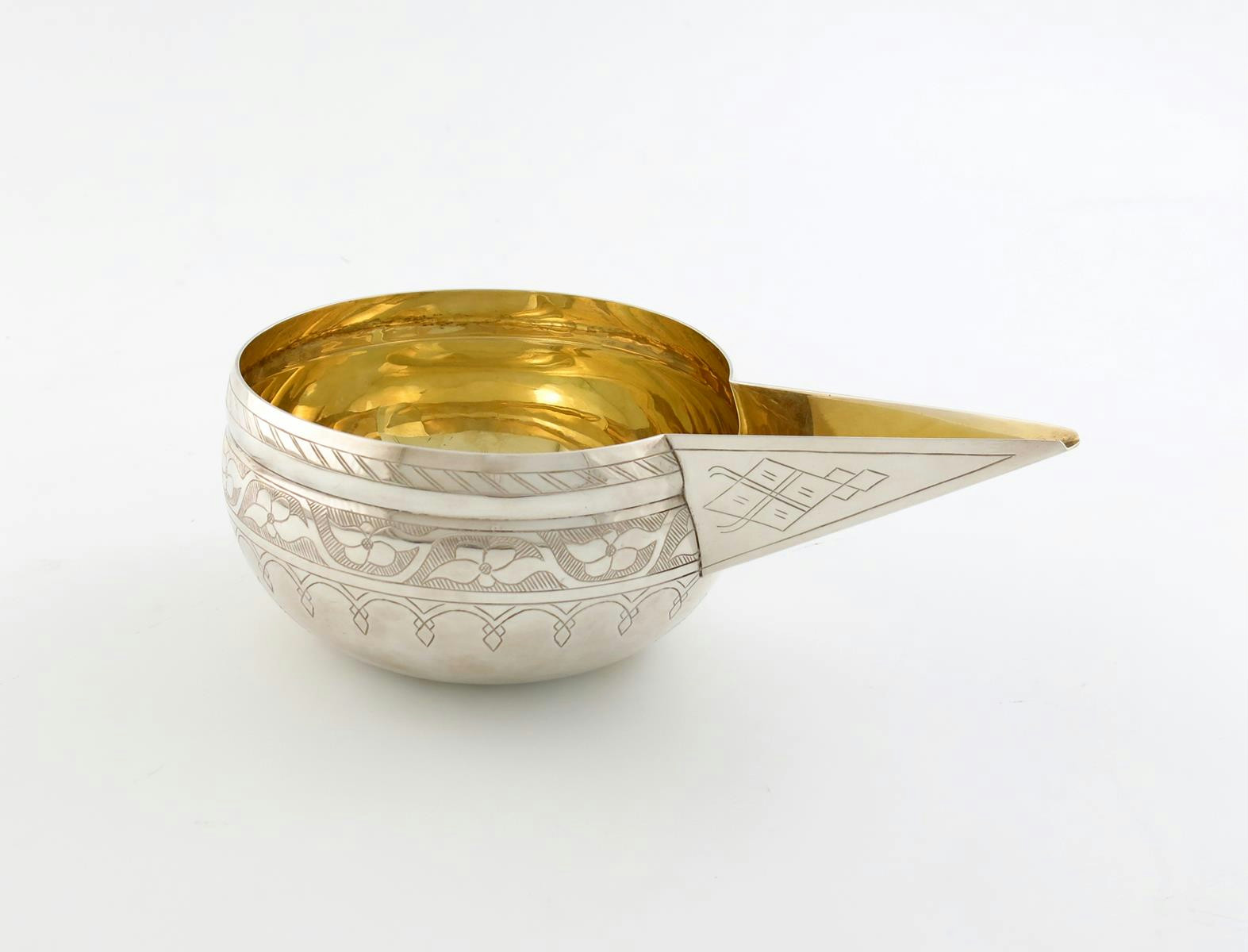 circular form, elongated spout / handle, engraved in the medieval manner, gilded bowl, length 22cm, approx. weight 10oz.