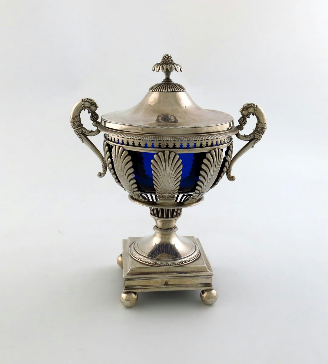 circular form, with fluted palm supports, lion head scroll handles, the pull-off cover with a pierced finial, on a raised square base on four ball feet, with a later blue glass liner, height 25cm, approx. weight 16.5oz.