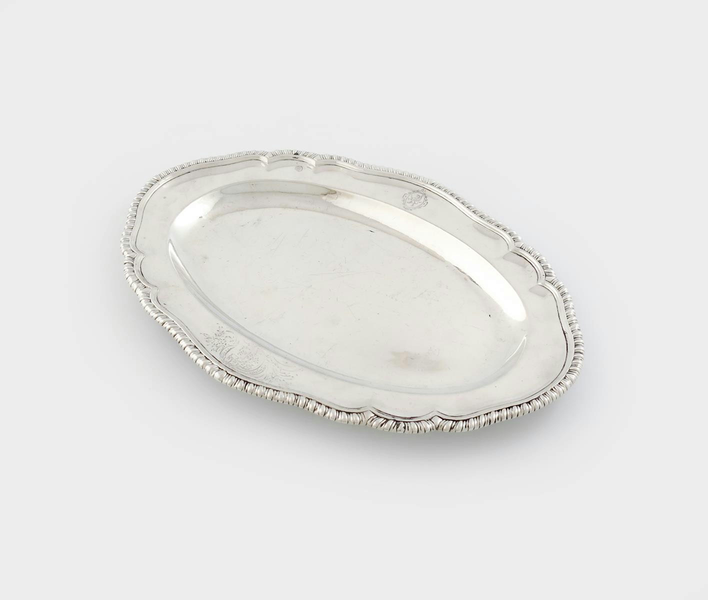 shaped oval form, gadroon border, engraved with an armorial and crest, length 30.8cm, approx. weight 17oz.