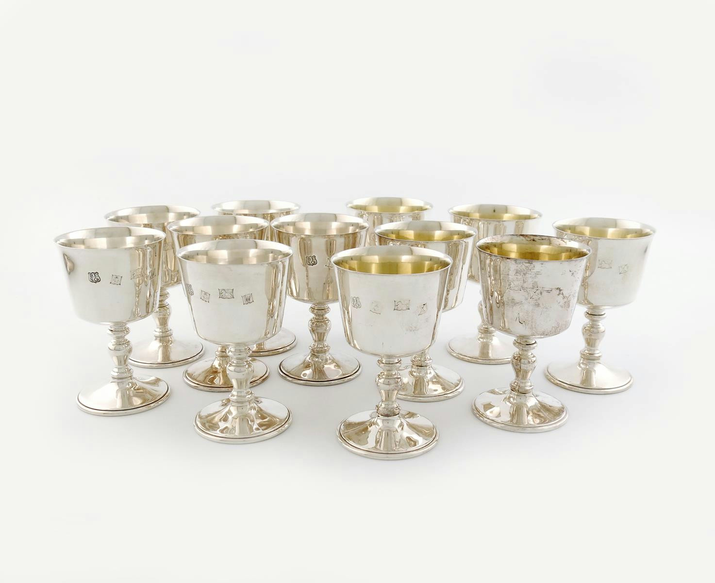 tapering circular bowls, on knopped baluster stems on spread circular bases, six with gilded bowls, height 11.8cm, approx. weight 64oz. (12)