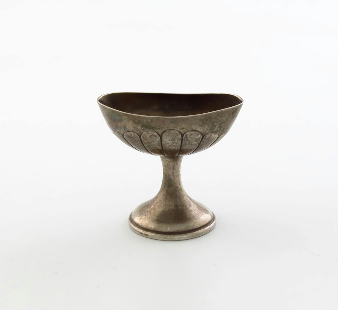 conventional oval form, part-fluted decoration, on a raised circular base, height 5cm, approx. weight 0.7oz.