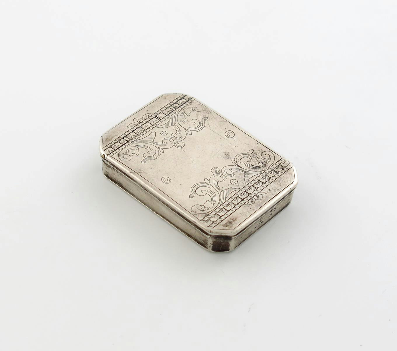 rectangular form, canted corners, the flush hinged cover with engraved foliate scroll decoration, length 6cm, approx. weight 1.1oz.