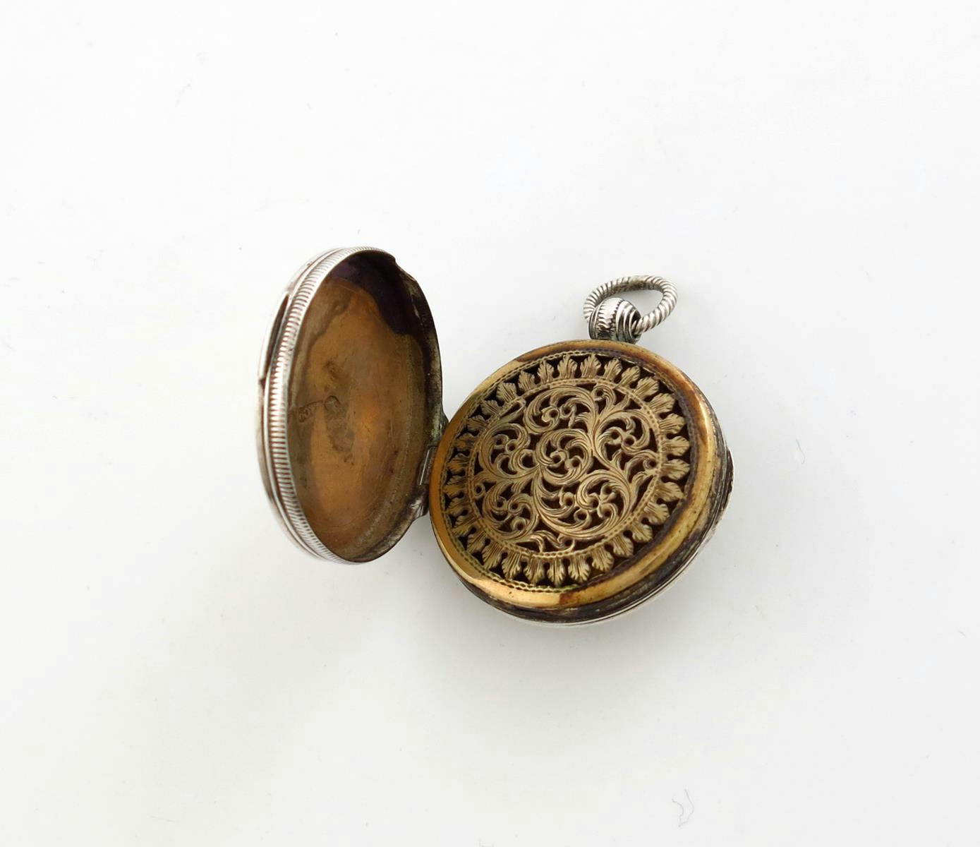 circular watch case form, engine-turned decoration, the hinged cover opens to reveal a pierced foliate scroll grille, with a ring attachment, diameter 3cm.