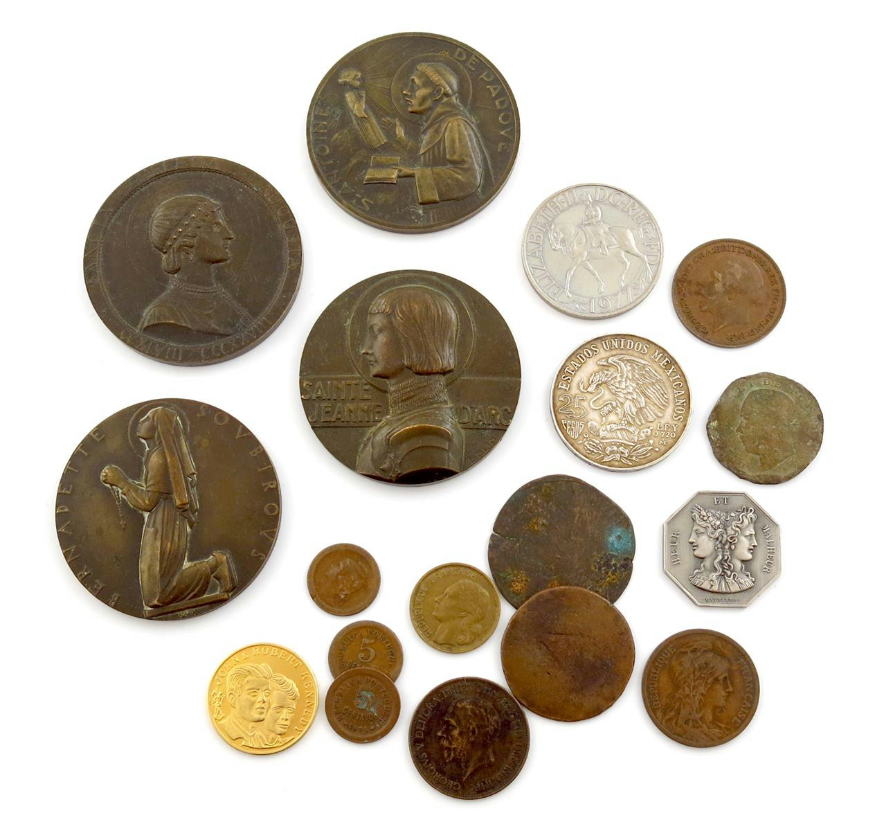 France, Jean d'Arc, bronze medal, by E. Blin; others (three), of Saints Bernadette, Helena and Antoine; together with a small quantity of British and world coinage, mostly in base metals. Medals very fine, the coinage poor, fair and fine. (qty)