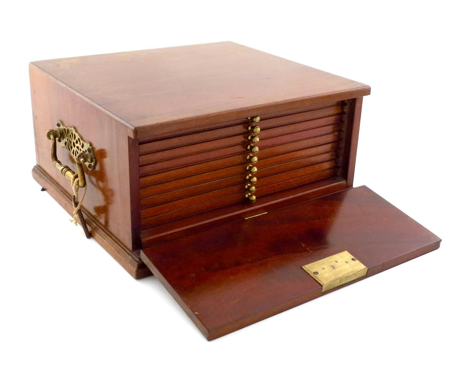 A mahogany coin collector's cabinet, by Spink & Son, with drop front, 9 trays finger-pierced for crown-sized coins and smaller, 270 x 250 x 130mm, brass carrying handles, lock and key. In good order.