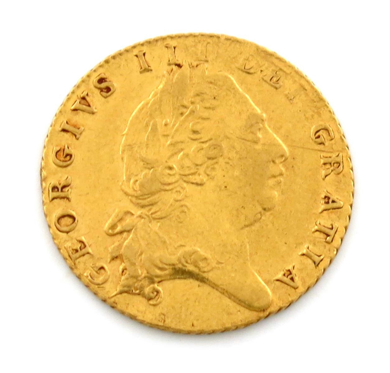 George III, Half-Guinea, 1801, sixth laureate head right, rev., crowned shield of arms within Garter (S. 3736). Good very fine.