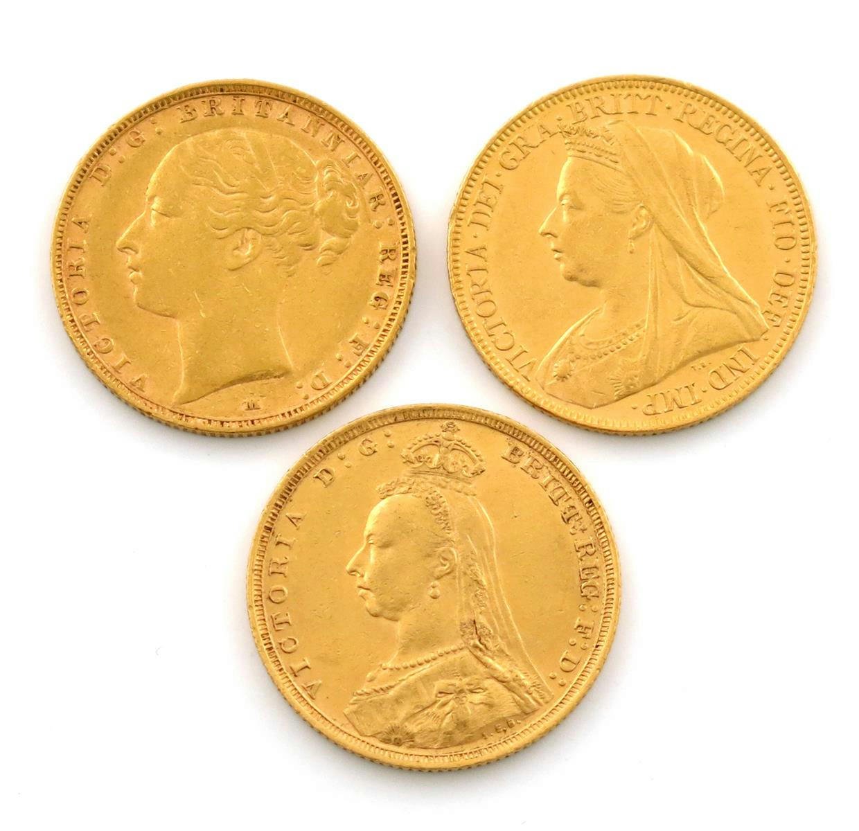 Victoria, Sovereigns, 1886 M, young head, St. George; 1890 S, Jubilee head; 1900 S, old head. Very fine. (3)