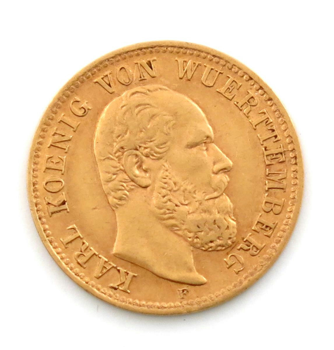 Germany, Empire, Württemberg, KarI, 5-Marks, 1877 F (F 3875). Good very fine.