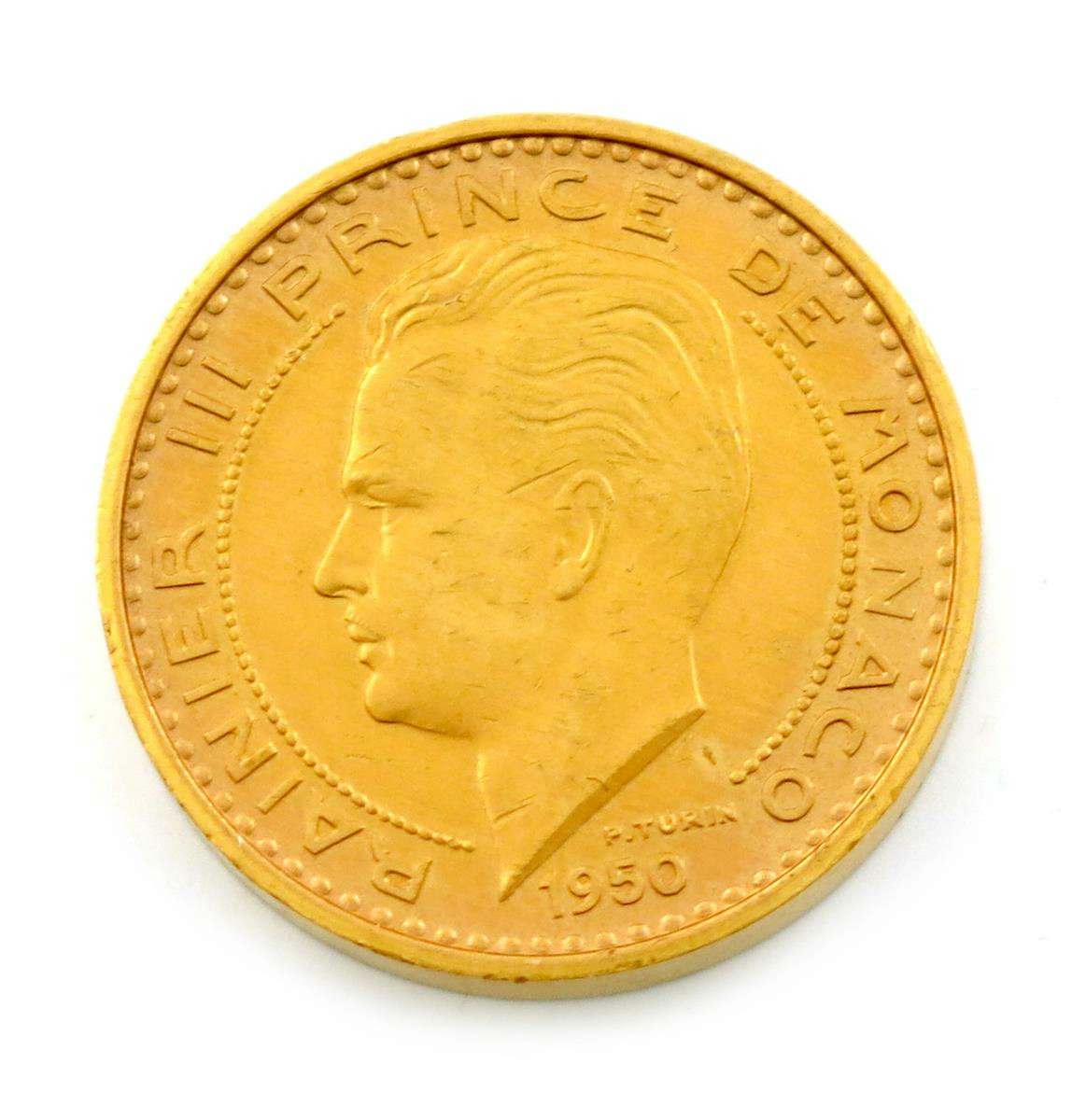 Monaco, Rainier, 50-Francs, Essai, struck in gold, on thick flan, by P. Turin, bust left, rev., mounted knight, 41.11g (F 26). Extremely fine.
