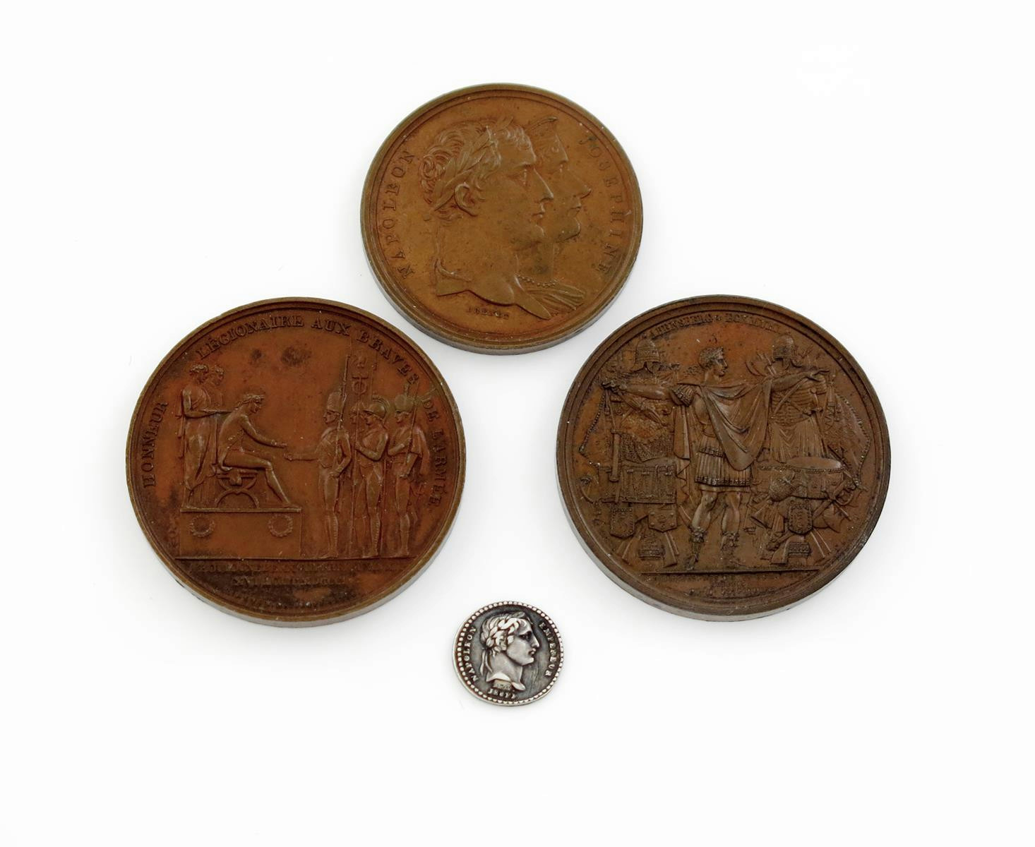 France, Napoleon Bonaparte, Coronation Celebrations, 1804, copper medal, by N Brenet, conjoined busts of Napoleon and Josephine right, rev., the French eagle, laureate, edge plain, 35mm (Br 359; Julius 1297); other copper medals (2), Napoleon distributes the Légion d'Honneur at the Camp de Boulogne, by Jeuffroy and Jalley rev., plan of the encampment, 41mm (Br 318; Julius 1248); the Treaty of Pressbourg, 1809, by Andrieu and Brenet, 40.5mm (Br 844; Julius 2077); and a miniature silver medal for his Italian Coronation, 1810, by Jeuffroy and Denon, bust right, rev., Napoleon held aloft, 13.5mm. This last very fine, the copper all extremely fine and all original strikings. (4)