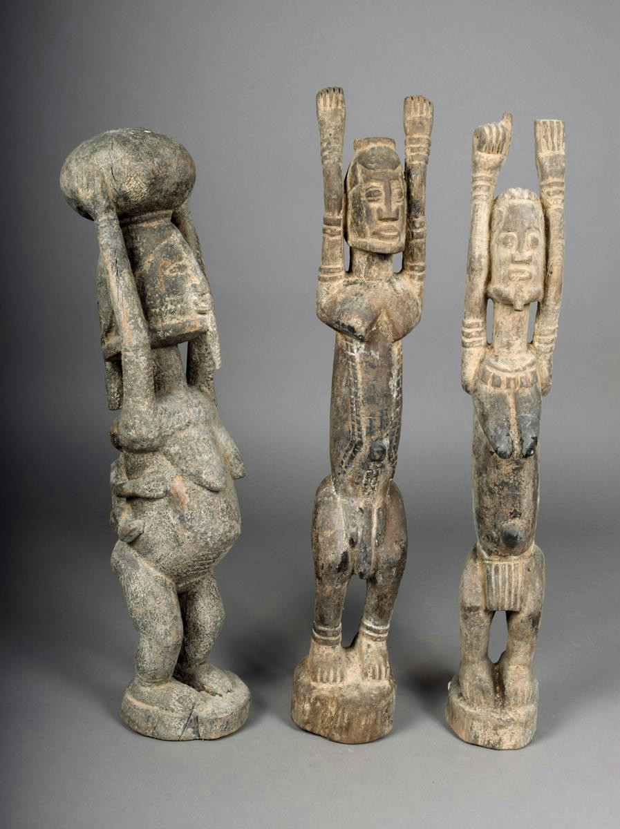 A pair of Dogon standing figures, male and female, with stretched arms, 67.5cm and 64cm high and a Dogon maternity figure with infant on back and pot on head, 62.5cm high. (3)
