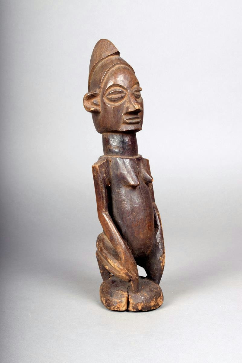 A Yaka kneeling female figure, D R Congo, with cap like coiffure and coffee bean eyes, 30.5cm high.