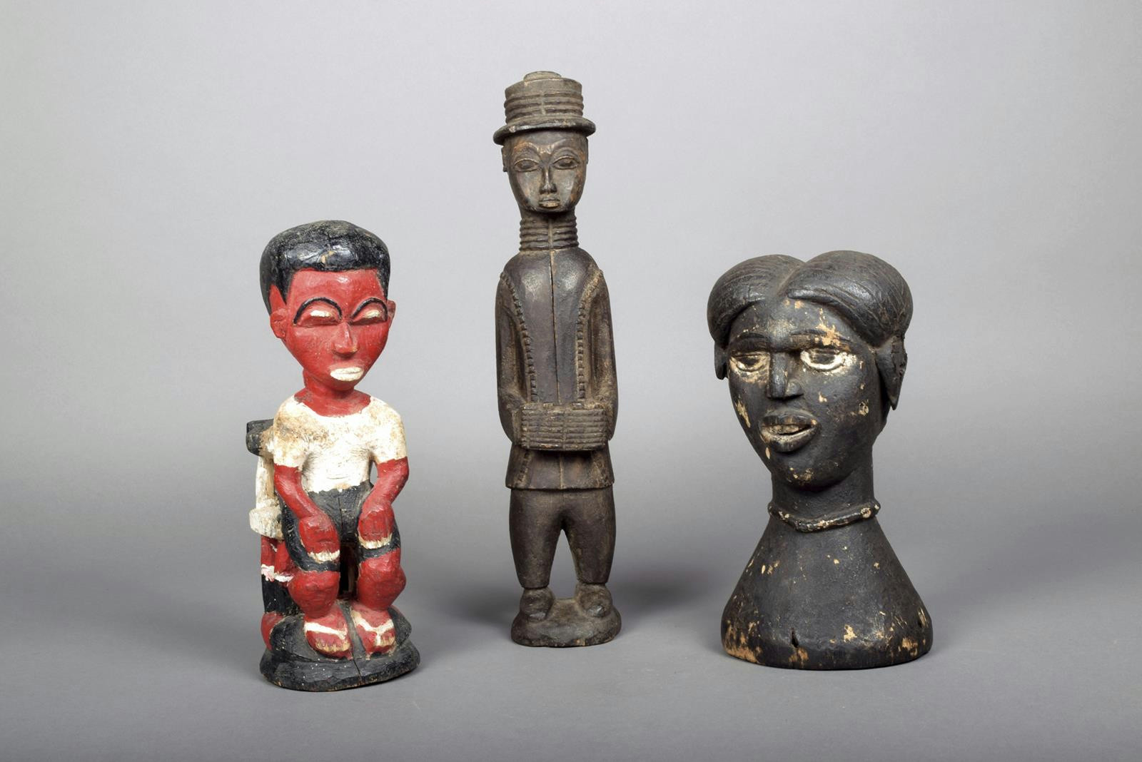A Baule Colon standing figure, Ivory Coast, wearing a ribbed hat and a tunic, 38cm high, a Baule Colon seated figure, painted red, white and black, 28cm high and an Ibibio female bust, Nigeria, 24.5cm high. (3)