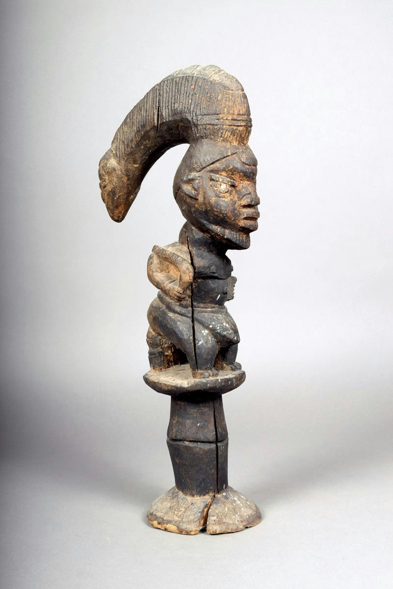 A Yoruba Eshu figure, Nigeria, seated with a scroll coiffure with mask terminal, on a column support, 50cm high.