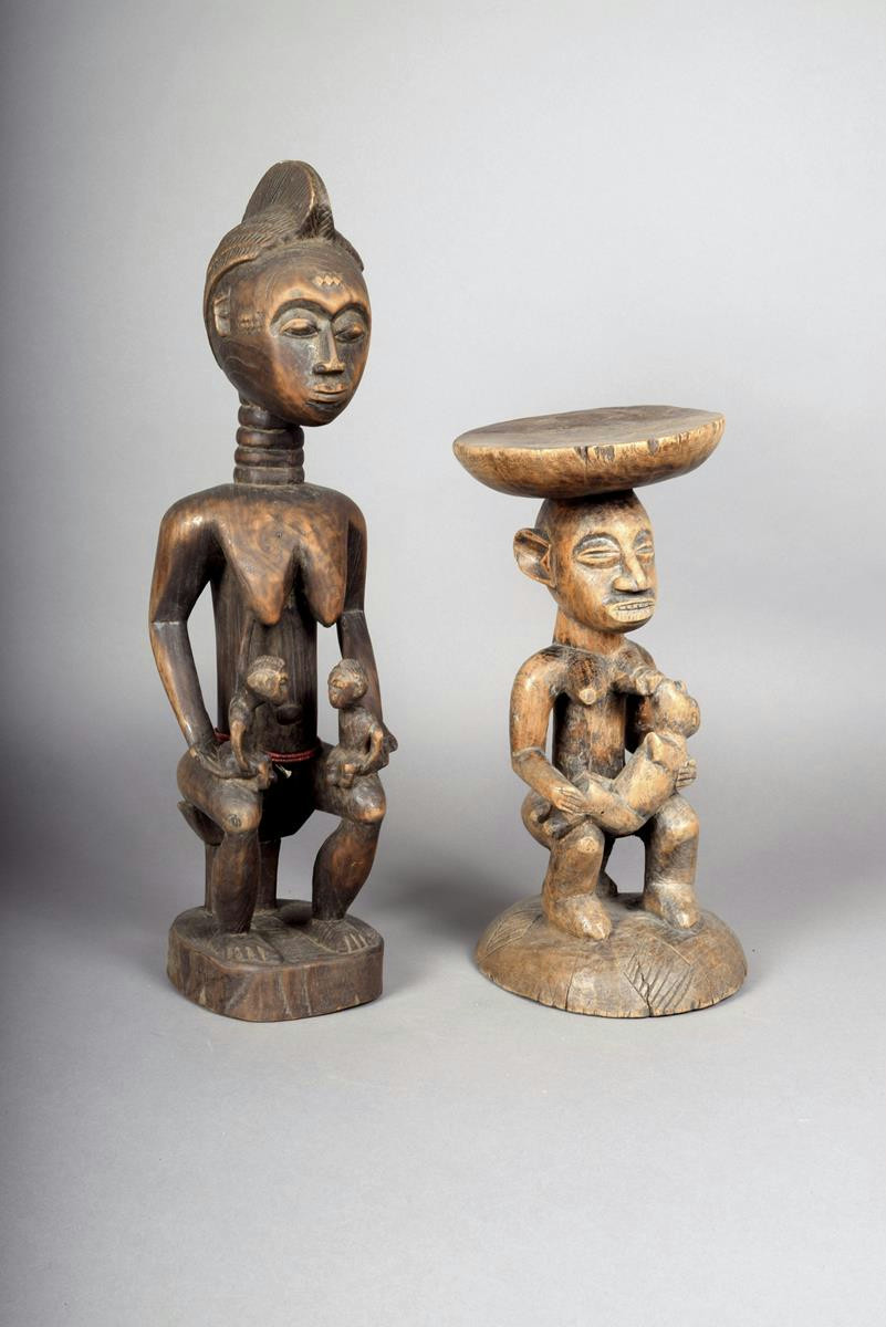 A West African stool, with a seated maternity figure support, 38cm high and a seated maternity figure with twins, 53cm high. (2)