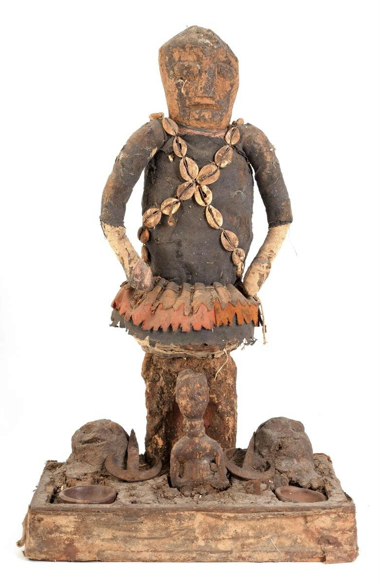 An East African offering figure, standing with clothes and shell bands, in a rectangular base with masks and a wooden torso with two clay bowls and hoe currency, 55cm high.