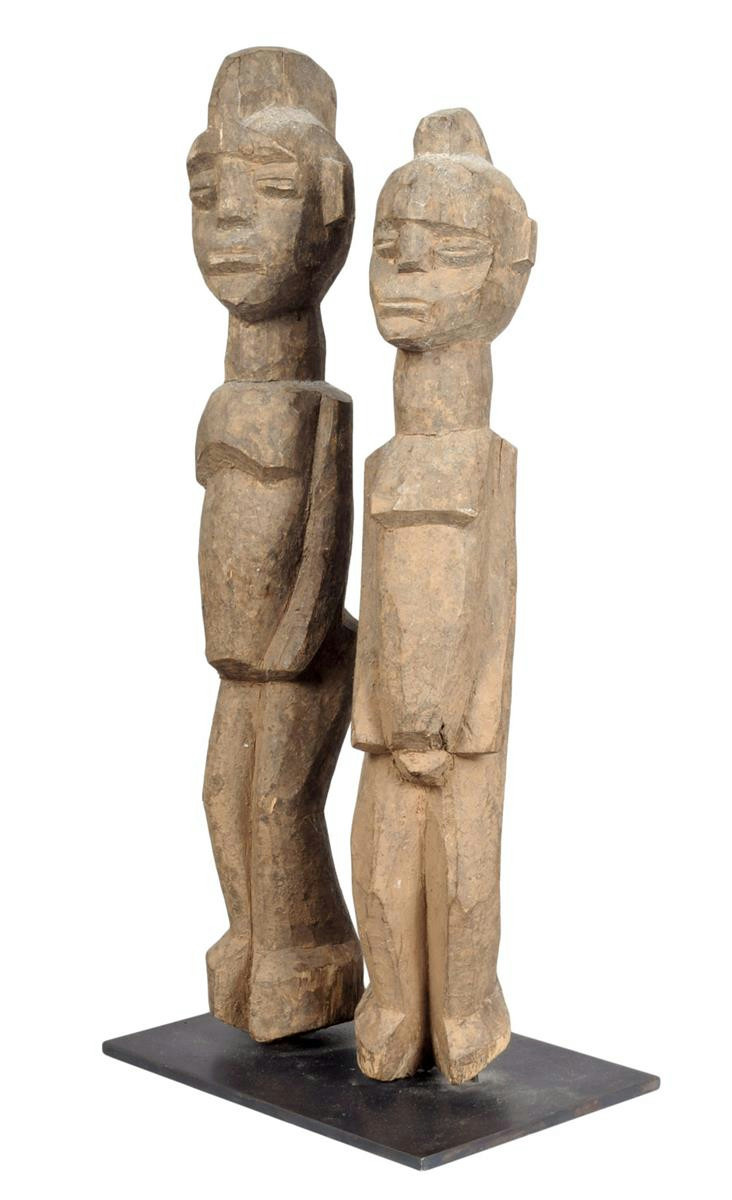 A pair of Lobi male and female standing figures, Burkina Faso, each with a single crest coiffure, 48.5cm and 44.5cm high, on a stand. (2)