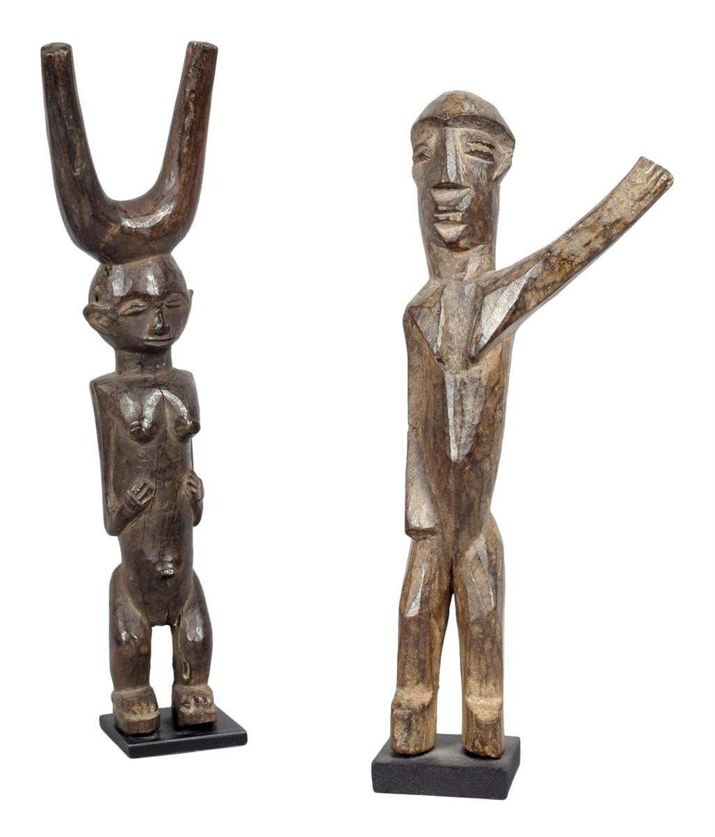 A Lobi standing female catapult figure, Burkina Faso, raised on platforms and with her hands placed on top of abdomen and U shape crest, 31cm high, on a stand and a Lobi standing female figure with her left arm raised to the side, 27.5cm high, on a stand. (2)