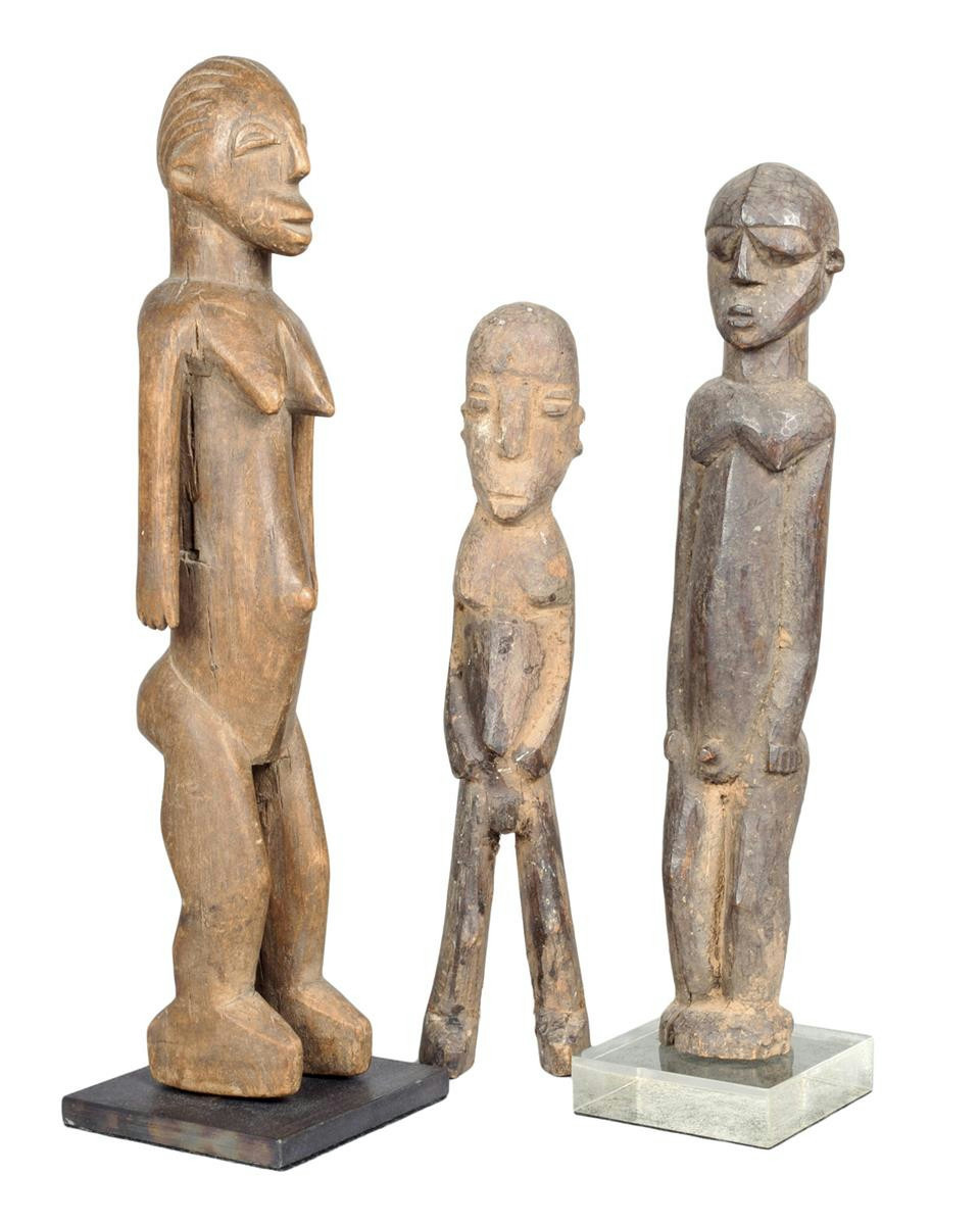 A Lobi standing male figure, Burkina Faso, with eliptical eyes, 31.5cm high on a stand, a Lobi standing male figure, with coffee bean eyes, 29cm high and a standing female figure with grooved coiffure, 36.5cm, high on a stand. (3)