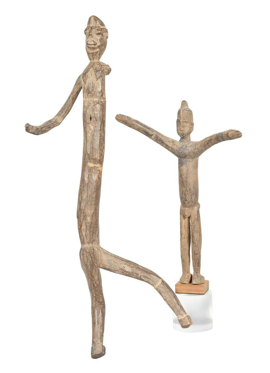 A Lobi standing male figure, Burkina Faso, with a single crest coiffure and with his arms raised, 45cm high, on a stand and a Lobi female figure, carved from a single branch, left arm missing, 76.5cm high. (2)