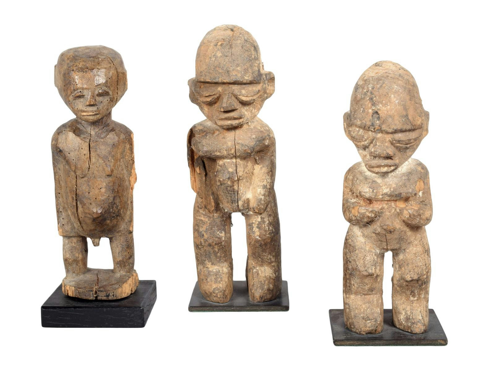 A Lobi standing female figure, Burkina Faso, with hands placed below her breasts, 15cm high, on a stand, a Lobi standing male figure, 15cm high, on a stand and a Lobi standing male figure with crescent eyes, 17cm high, on a stand. (3)