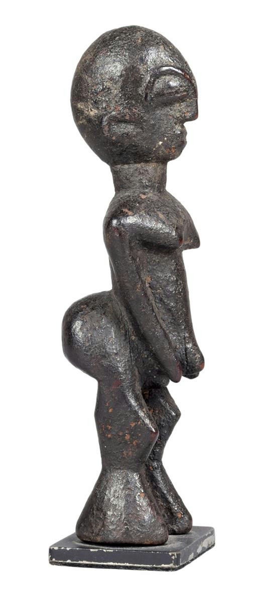 A Lobi standing figure, Burkina Faso, with encrusted patination, with straight arms squeezing his stomach, with high buttocks, 15.5cm high, on a stand.