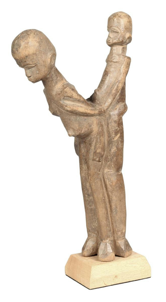 A Lobi copulating couple, Betiste, Burkina Faso, the male with his hands on his partner's breasts, 30cm high, on a stand.