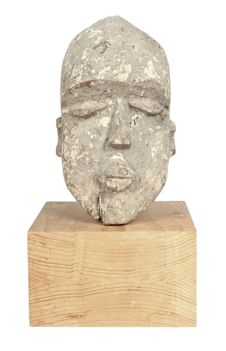 A Lobi head, Burkina Faso, with an encrusted white/grey patina, with eliptical eyes and an accentuated mouth, on a short tapering spike, 27cm high, with stand.
