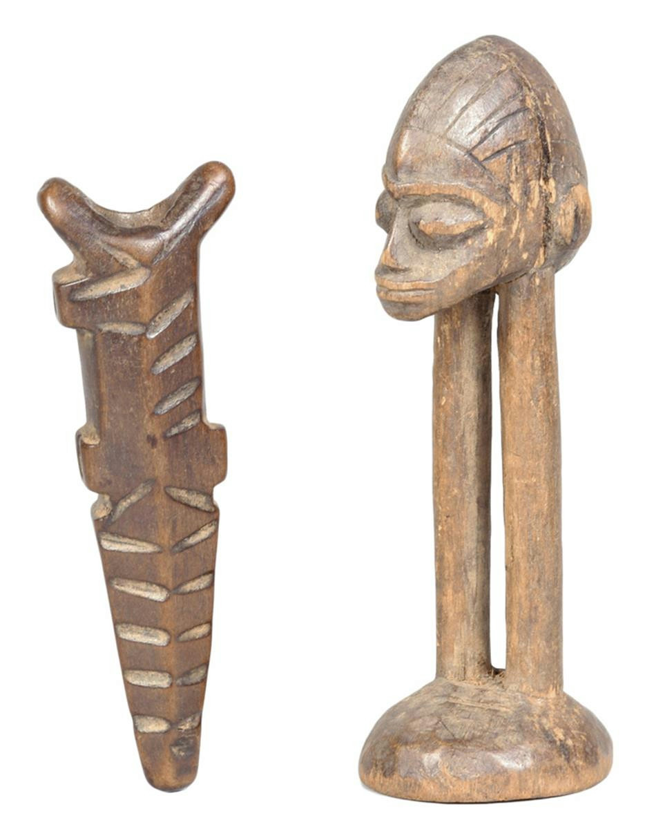 A Lobi anthropomorphic figure, Burkina Faso, of a medial ridge head with incised coiffure supported by a pair of legs on a domed base, 12cm high and a Lobi miniature whistle flute, with incised line decoration, 10cm high. (2)