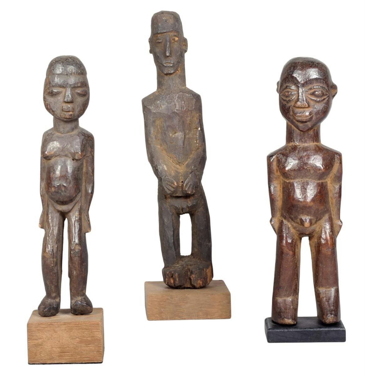 A Lobi standing male figure, Burkina Faso, with arms to the side, 20.5cm high with a stand and two Lobi standing figures, 24cm and 19cm high, on stands. (3)