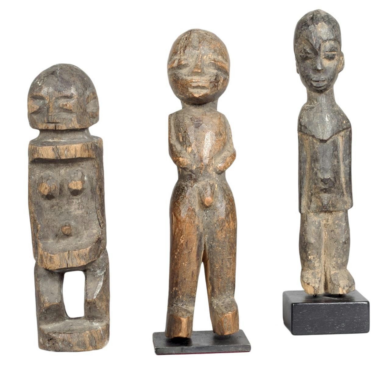 A Lobi standing male figure, Burkina Faso, with arms by his side, 25cm high, on a stand, a Lobi standing male figure, with a backwards lean, 26.5cm high, on a stand, a Dogon carved female figure, 22.3cm high, on a stand. (3)