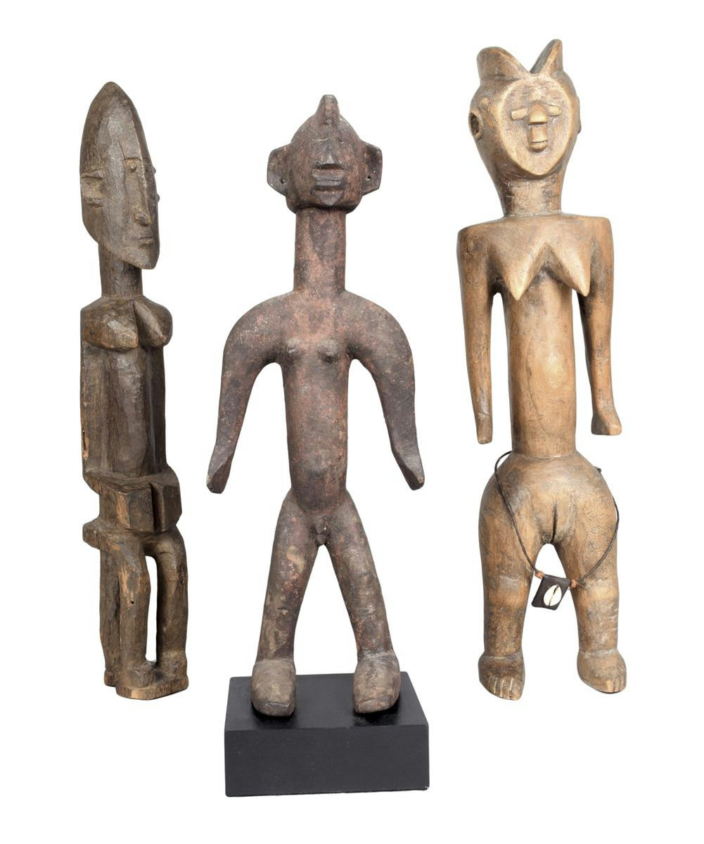 A Dogon seated female figure, Mali, 51.5cm high, a Mossi standing figure, with single crest and incised lines to the back, 42.5cm high, on a stand, a Kwere standing female figure, with leather and cowrie shell pendant, 52.5cm high. (3)