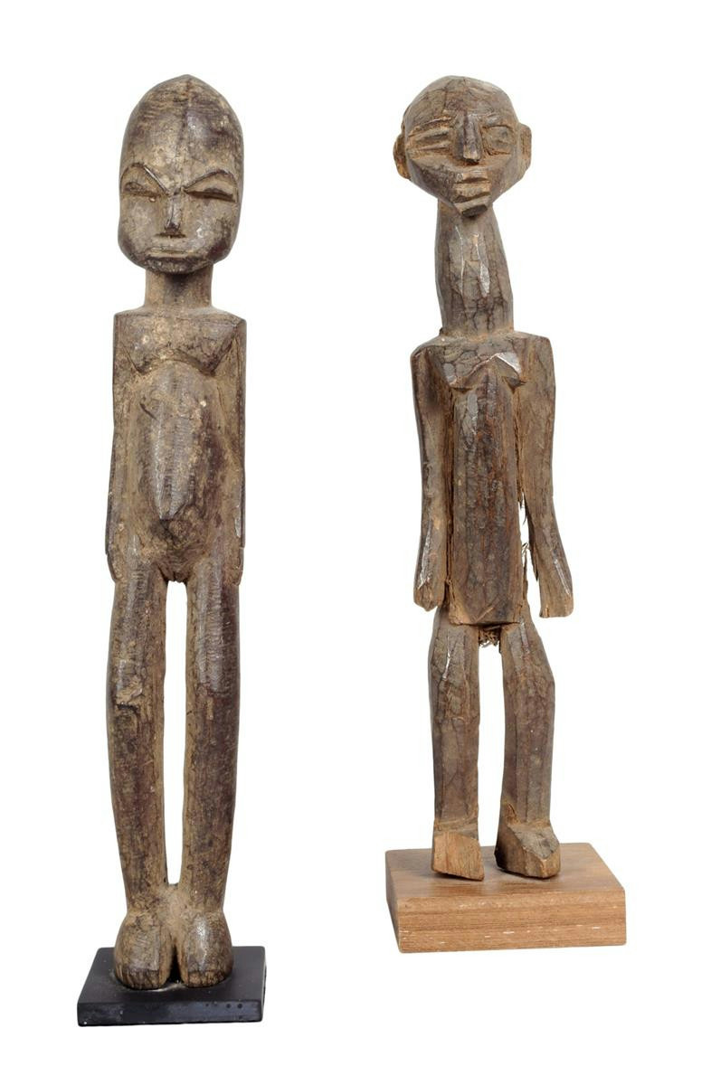 A Lobi standing female figure, Burkina Faso, 32cm high, on a stand and a Lobi standing figure with a long neck, 32cm high, on a stand. (2)