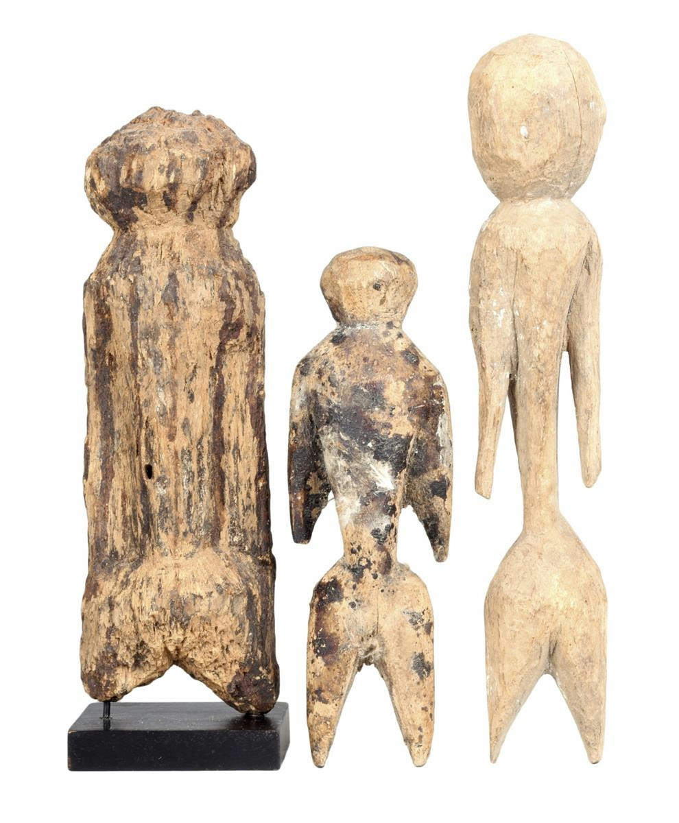 A Moba figure, Togo, of simple human form, 17.5cm high, on a stand, and two Moba similar figures, 14.5cm and 20.5cm high. (3)